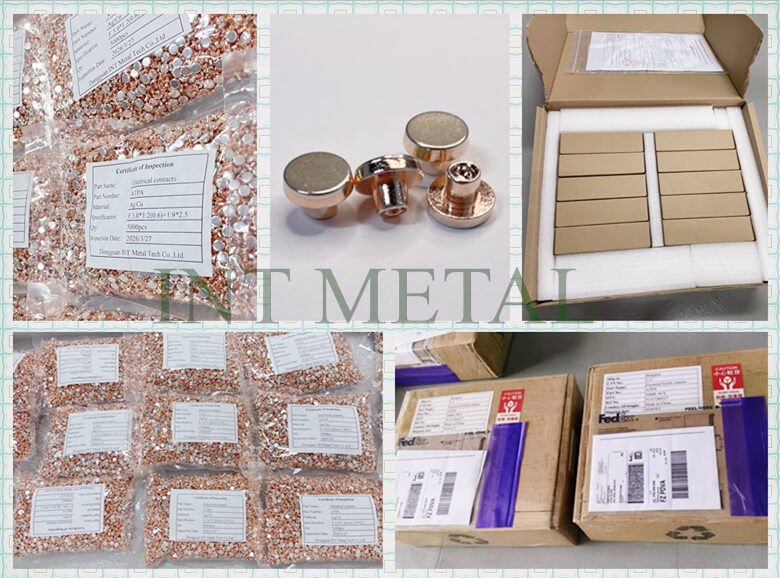 DONGGUAN INT METAL TECH CO LTDвъзприема процеса на студено пресоване на композит (студено зареждане), който комбинира сребро или сребърна сплав с мед в твърдо състояние чрез огромно налягане. Този процес осигурява равномерна дебелина на сребърния слой и изключително висока якост на свързване сребърни контактипроизведени отINT МЕТАЛможе да гарантира надеждност през целия живот на продуктите на клиента.